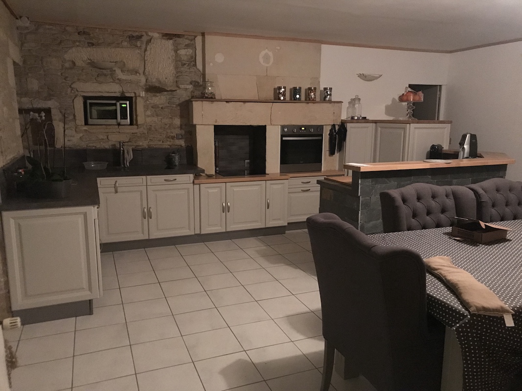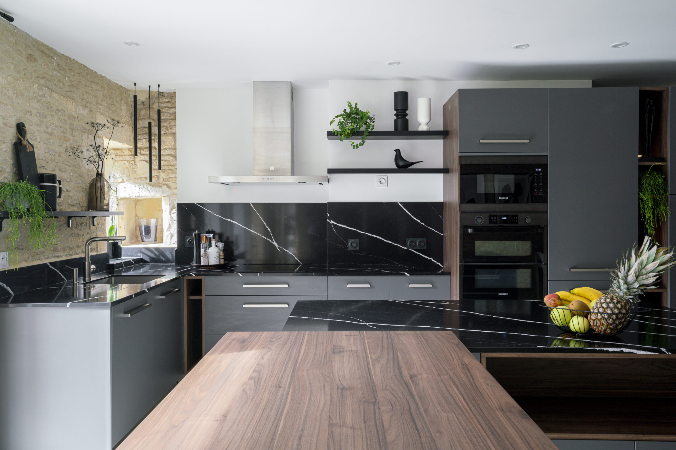 Une nouvelle cuisine a remplacé l’ancienne, beaucoup plus fonctionnelle et respectant les normes actuelles. Le choix des matériaux et l’association des couleurs donnent du caractère à cette pièce. Les tons foncés sont mis en valeur par la couleur neutre du sol en grès cérame, ainsi que les nombreux points lumineux qui ont été créés.