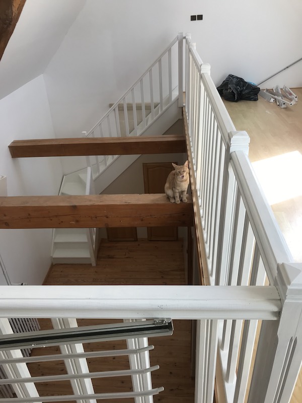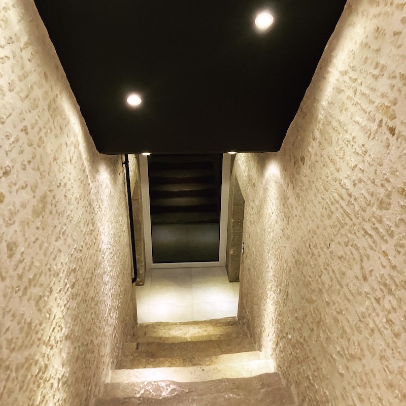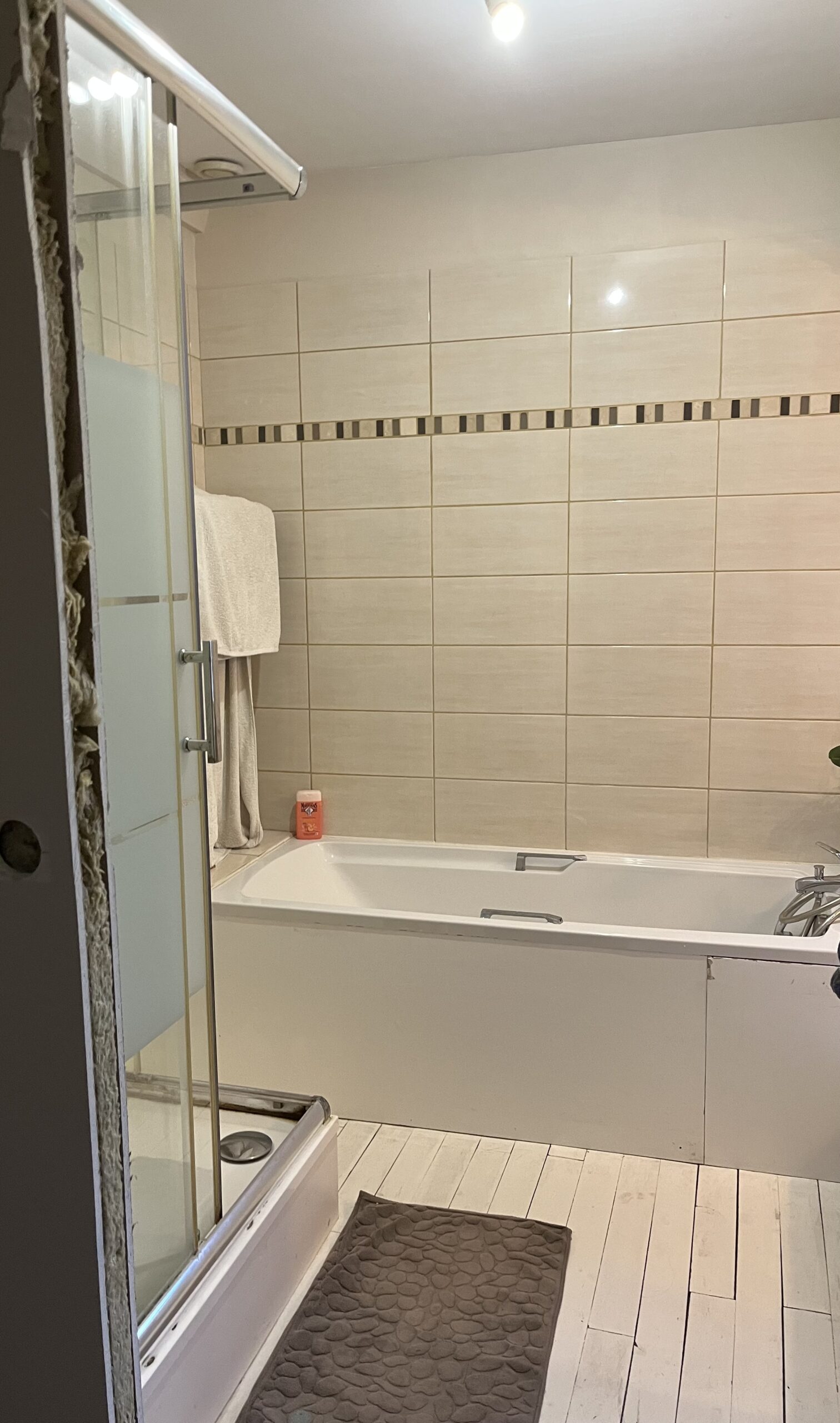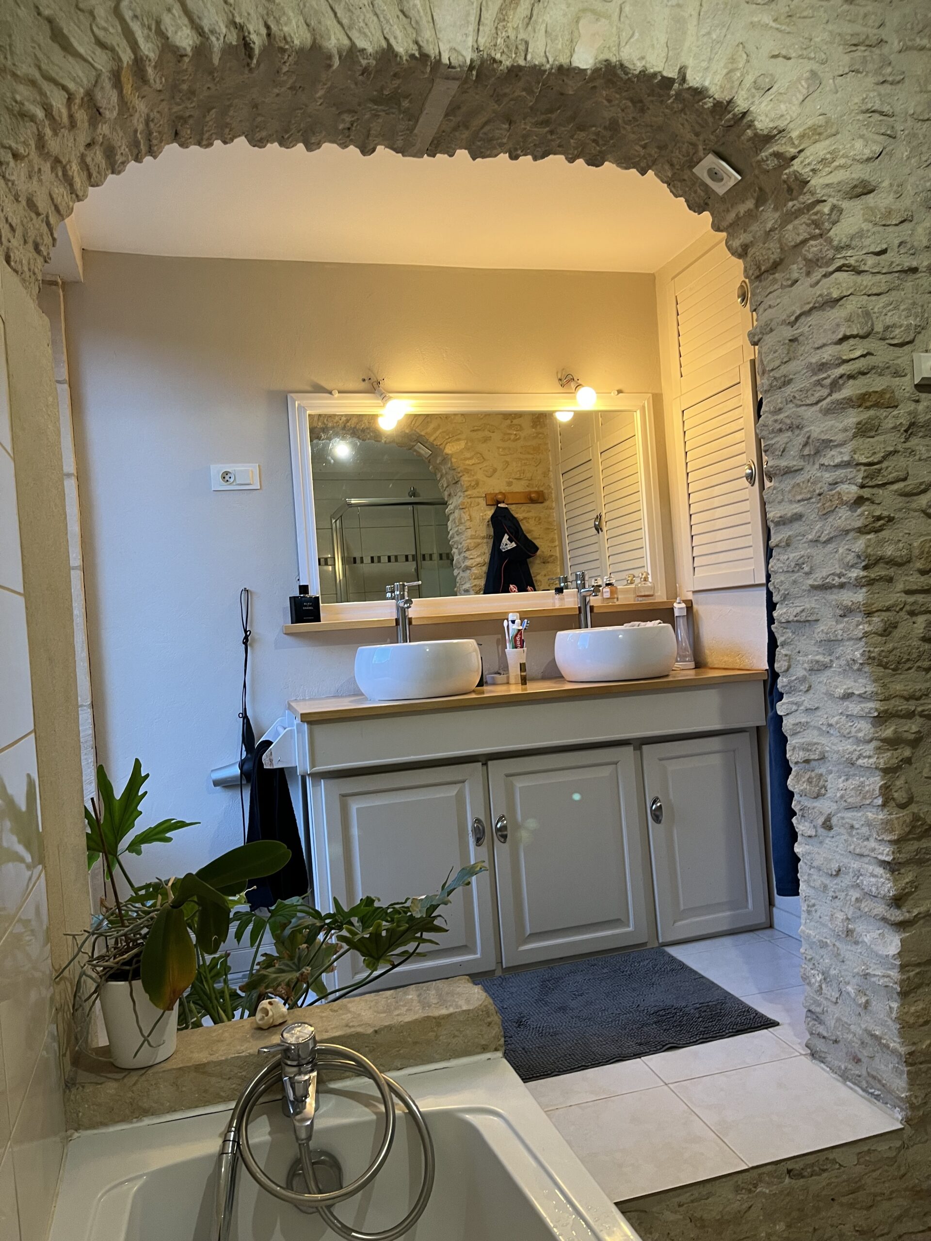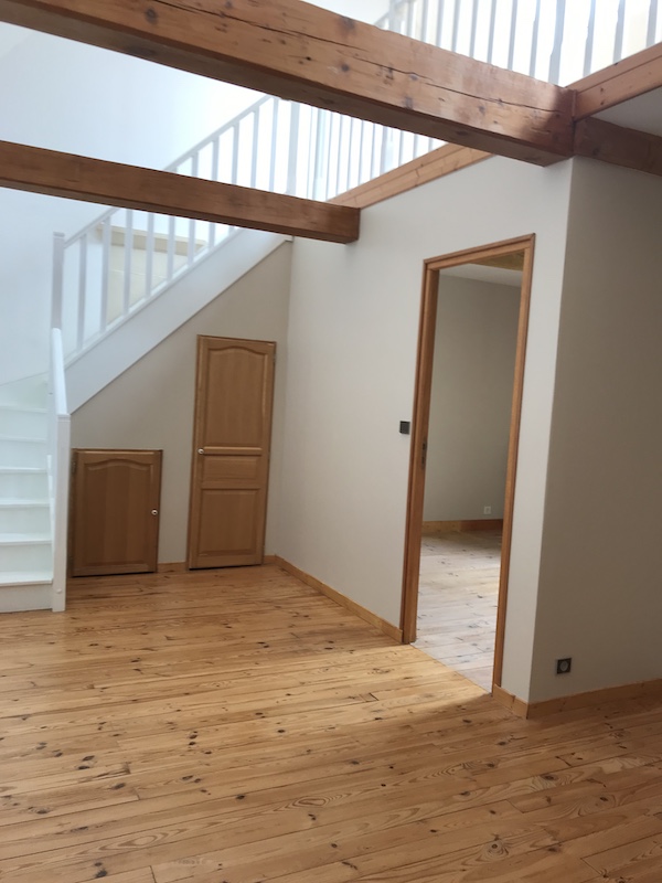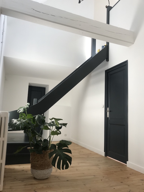 Ce palier était relativement grand, la cloison a donc été modifiée afin d’agrandir la salle de bain qui se trouve derrière la seconde porte. Le plâtre sur le mur du fond a été retiré afin de mettre en valeur le mur ancien de cette maison, et la rampe de l’étage complètement supprimé pour laisser place à une cloison plus moderne .