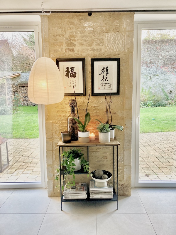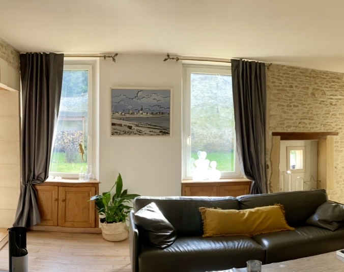 Les propriétaires souhaitaient un accès direct à la terrasse et plus de luminosité, un changement des menuiseries s’avérait nécessaire. Il a été complété par une mise en valeur des murs en pierre qui étaient dissimulés derrière le placoplâtre ainsi que le changement du sol. Une petite fenêtre inutile et simple vitrage a également été supprimée pour des raisons pratiques et thermiques afin de laisser place à une petite bibliothèque.