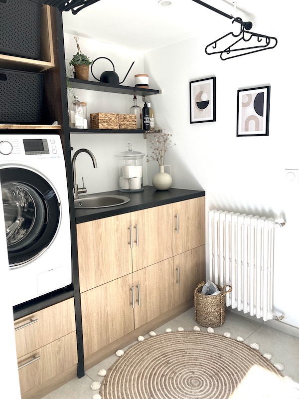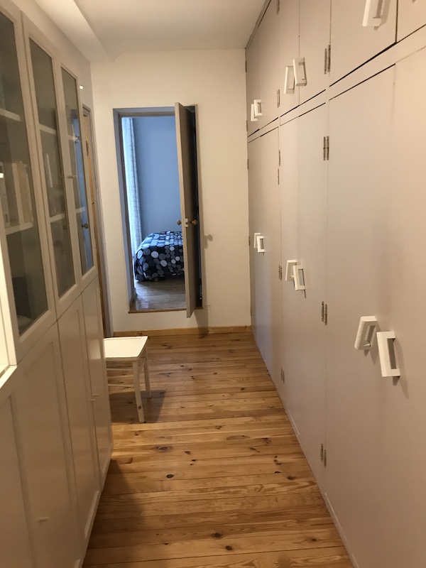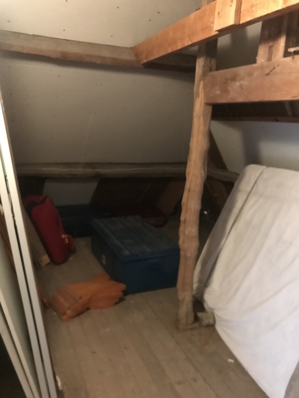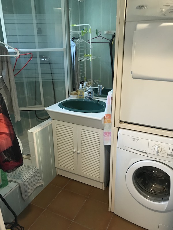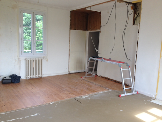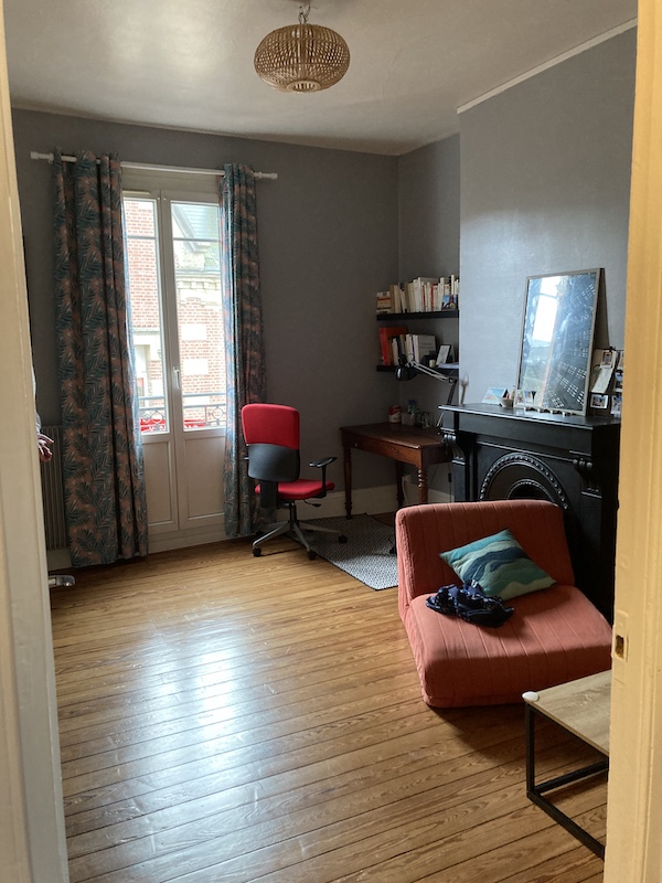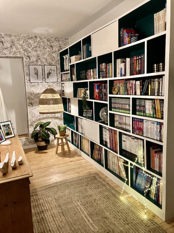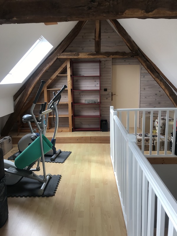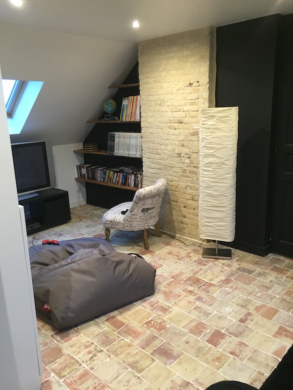 Cet espace était encombré par un vieux placard vétuste. S’agissant d’une pièce sur laquelle donnait les chambres des enfants, un coin détente avec une bibliothèque en médium ont été construits afin d’y loger tous les livres de la famille. La destruction de ce placard a également permis de gagner environ 4m2 de surface habitable.