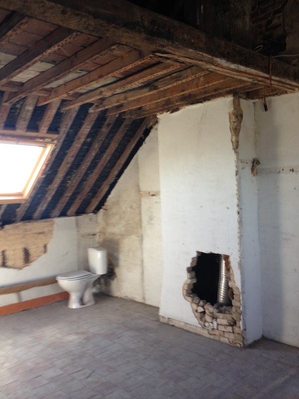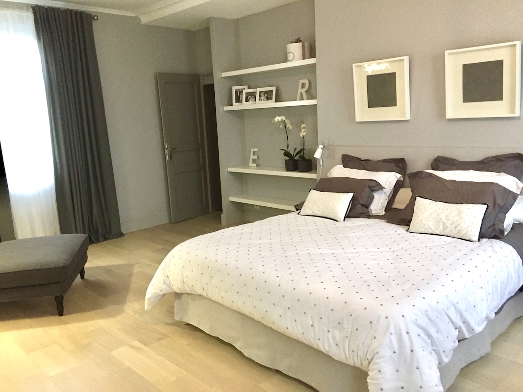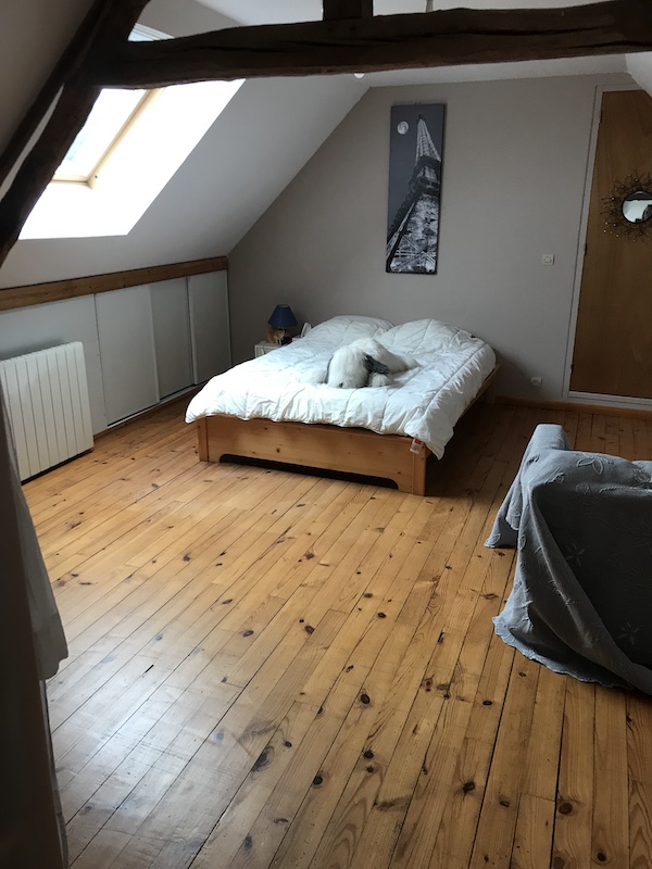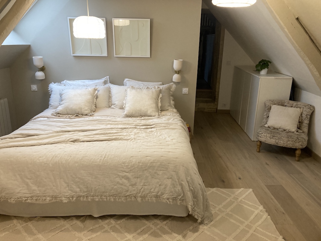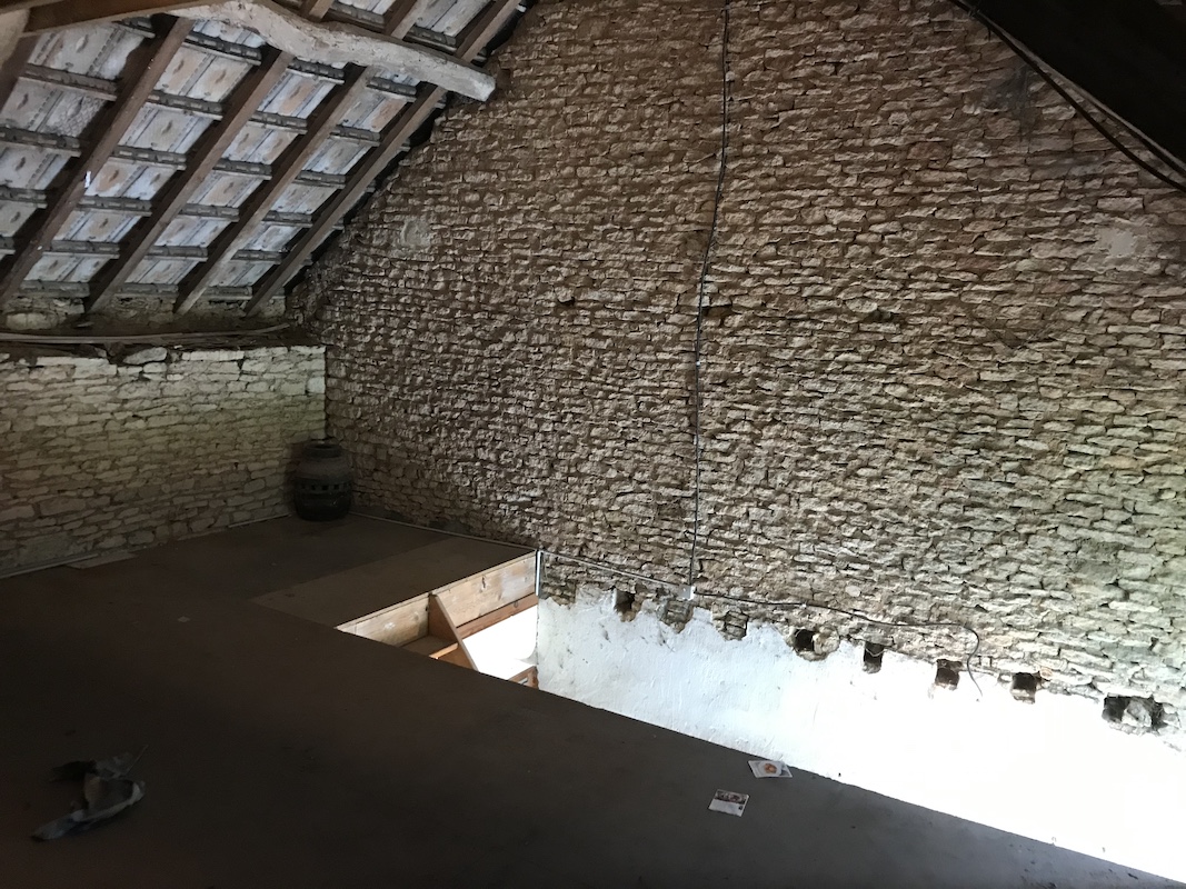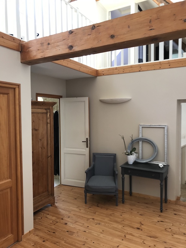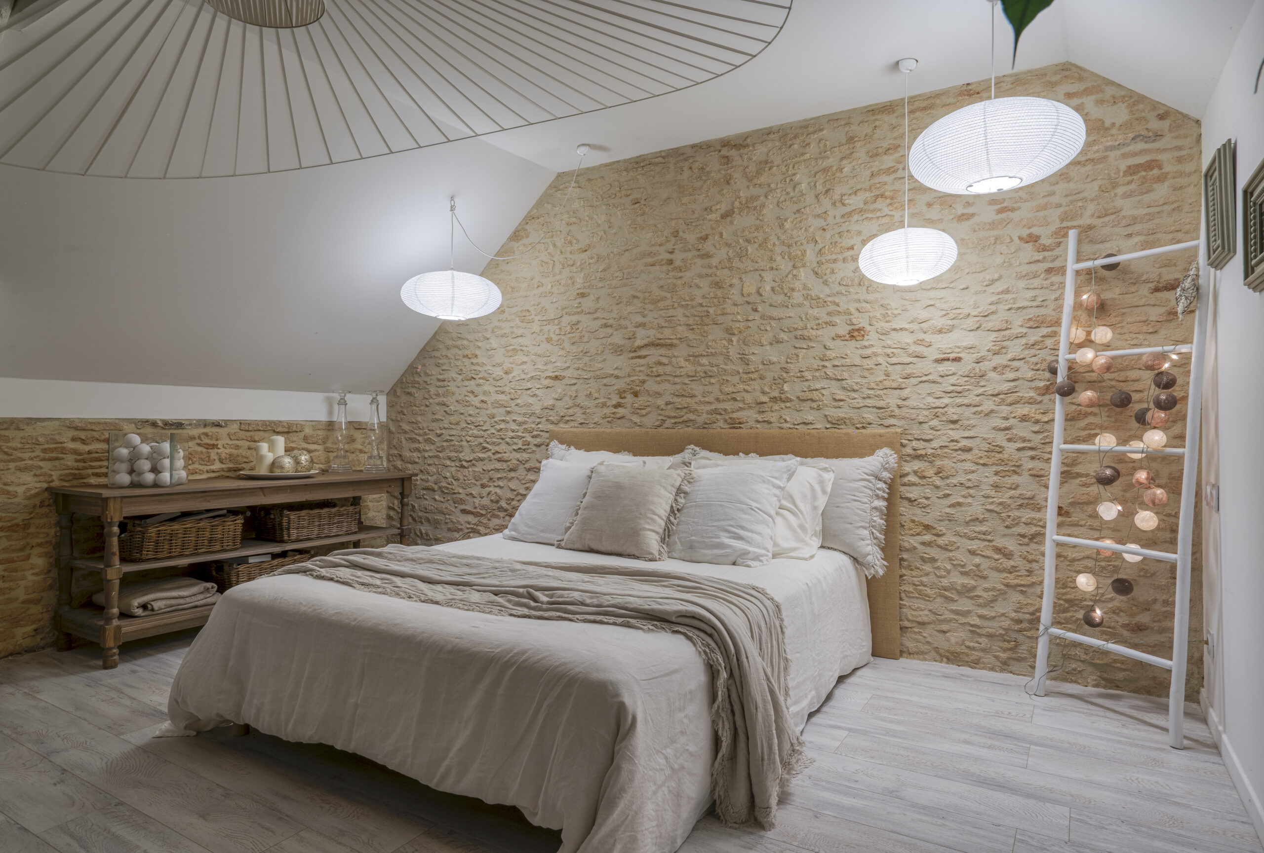 Il fallait créer une chambre supplémentaire dans cette maison et l’opportunité de transformer ce grenier d’une belle surface accolée au premier étage de la maison était évidente. La trémie d’escalier a donc été condamnée, l’isolation des sols et des rampants réalisés et ce magnifique mur conservé. Le camaïeu de beige et de grège s’associe très bien avec les pierres.