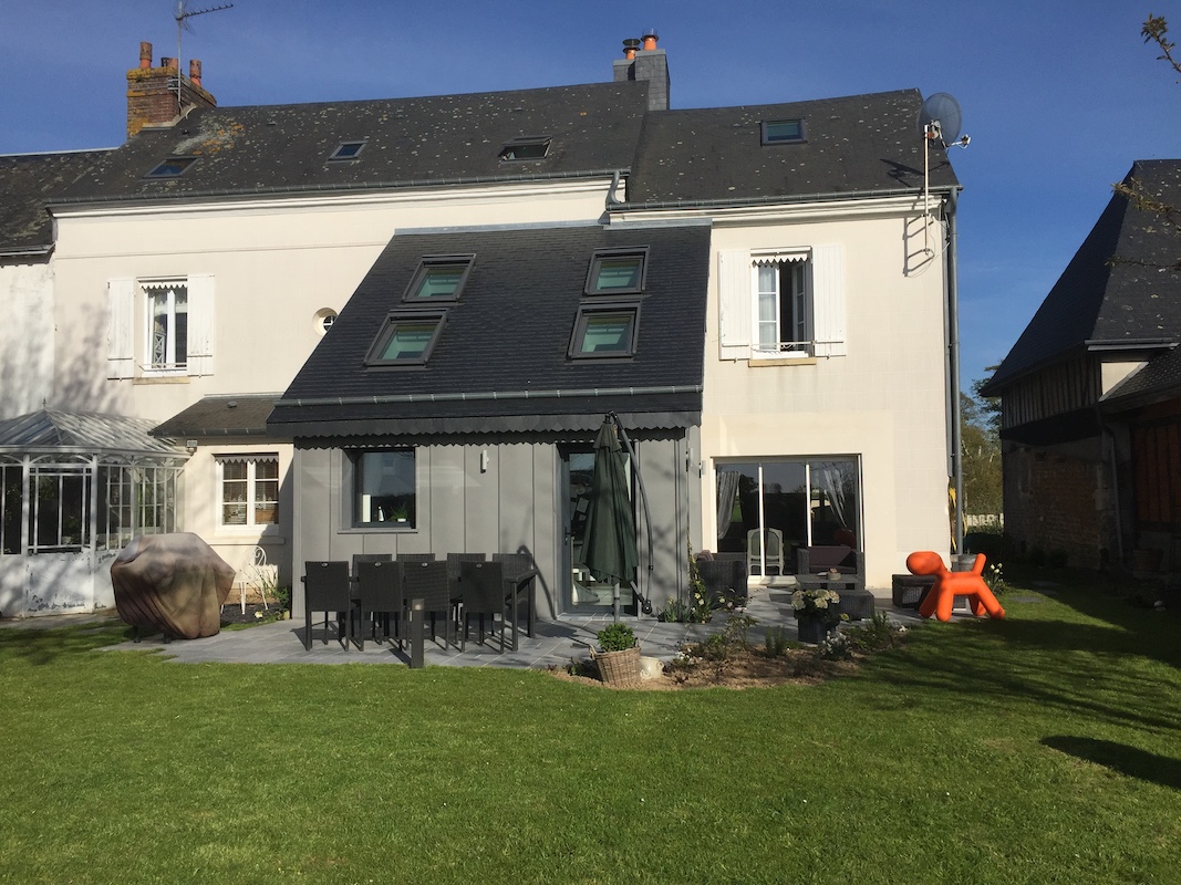 Dans ce projet, l’ancienne cuisine était mal exposée et loin des pièces à vivre. Cette extension a permis d’y installer la nouvelle cuisine dans laquelle une grande baie fixe toute hauteur au sud et 4 velux a l’ouest ont permis d’apporter beaucoup de luminosité.