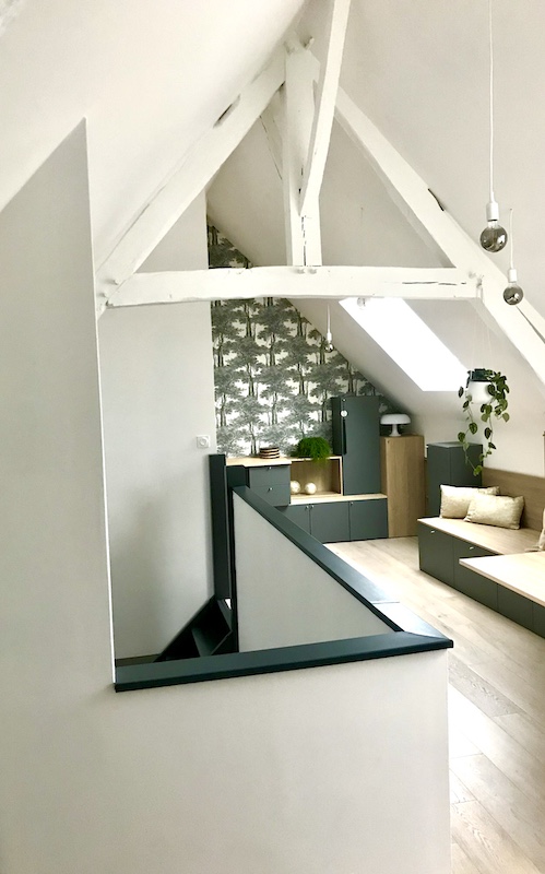 Cette maison bénéficiait d’une très grande mezzanine et les propriétaires souhaitaient un coin bureau pour le télétravail.La suppression de l’escalier actuel a permis d’agrandir la mezzanine de l’étage supérieur de 5 m² supplémentaires et d’y loger un bureau. Le tout a été modernisé grâce a des tons blanc et gris et au nouvel escalier fait sur mesure.