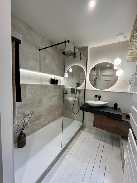 Il a fallu beaucoup d’imagination pour agencer cette salle de bain. Les propriétaires voulaient une grande douche, une baignoire ilot et un WC, le tout dans une pièce en L de 9 m2. Il fallait modifier l’agencement afin d’inverser la disposition et éviter de monter quotidiennement la grande marche situé entre les 2 volumes. Nous avons optimisé l’espace en nous servant des murs qui dissimulent les évacuations pour intégrer des supports de rangement ou des luminaires